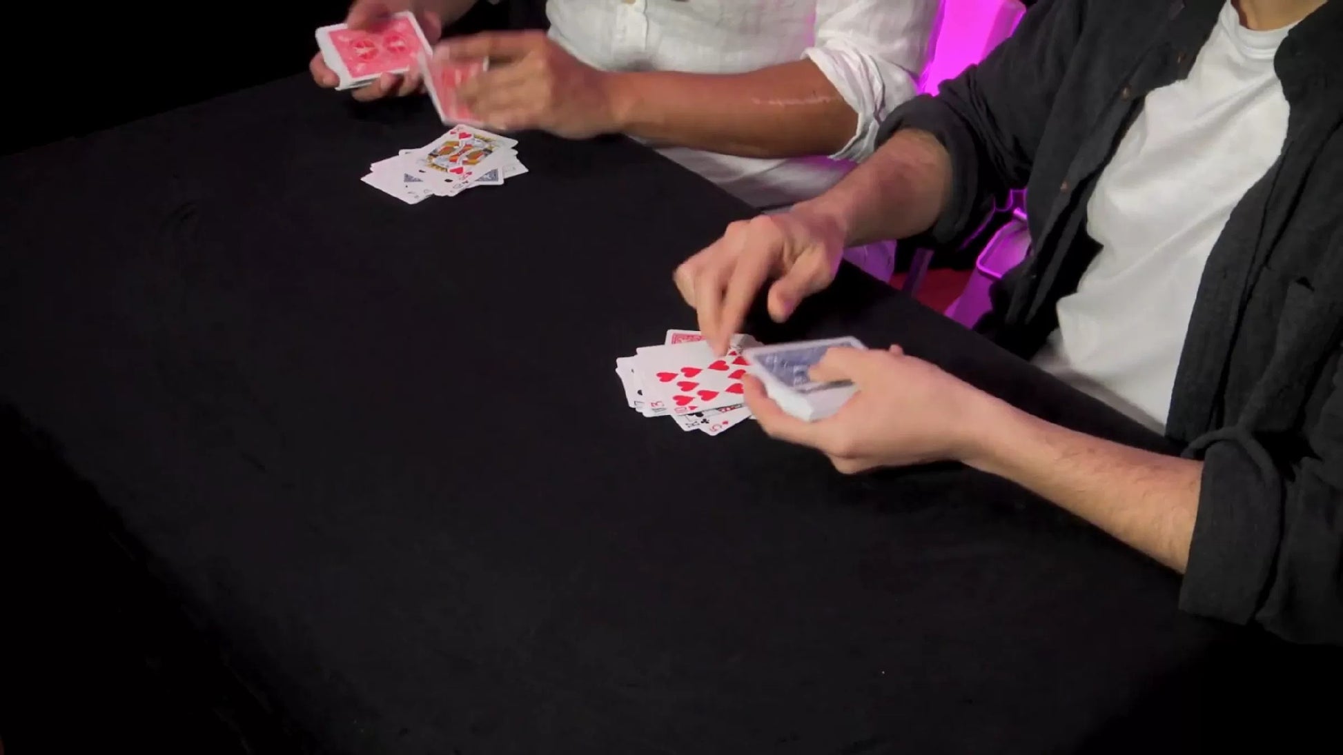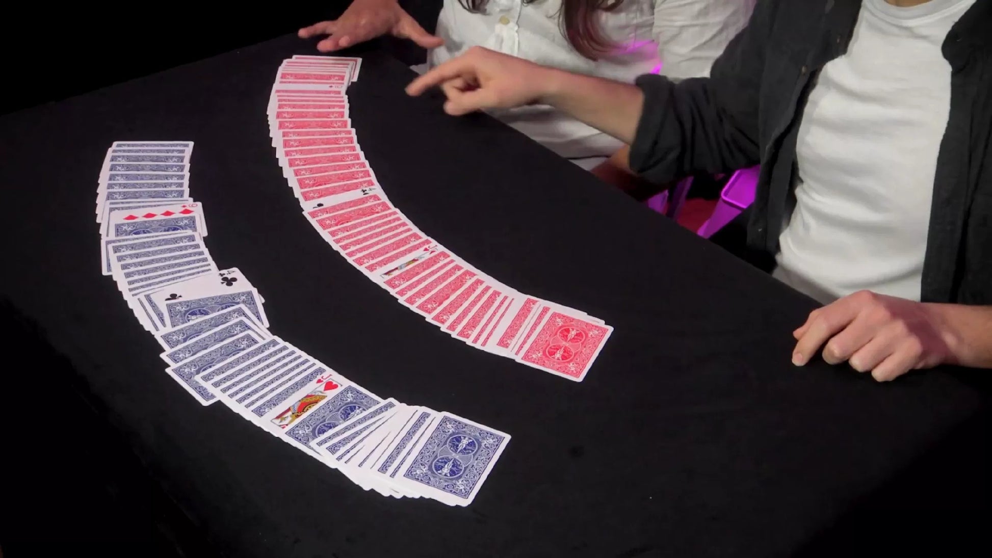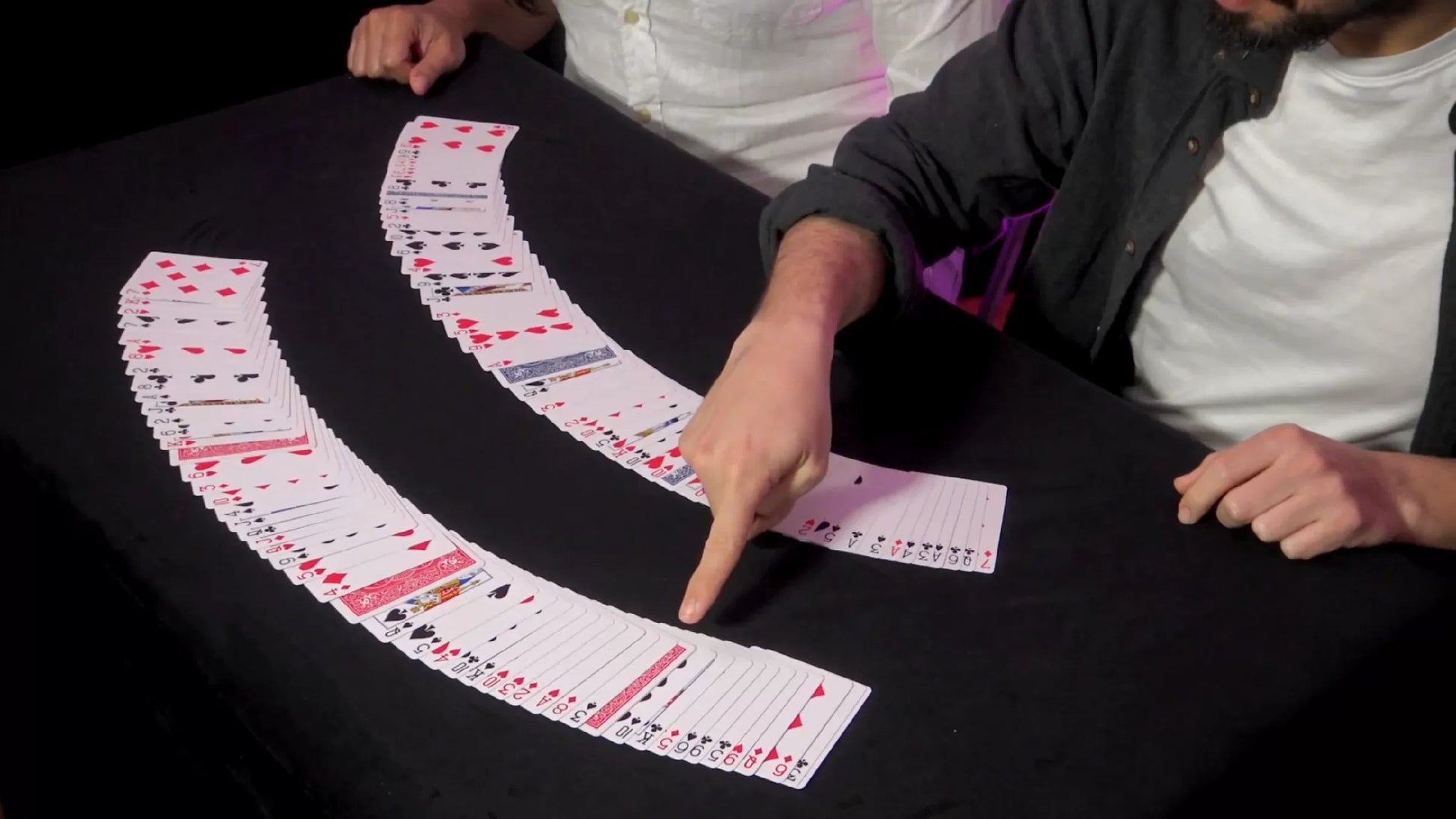 Fairly and cleanly, the magician spreads both decks face-up, and three cards with matching backs are clearly visible. When the spreads are turned over, those three face-down cards match perfectly!